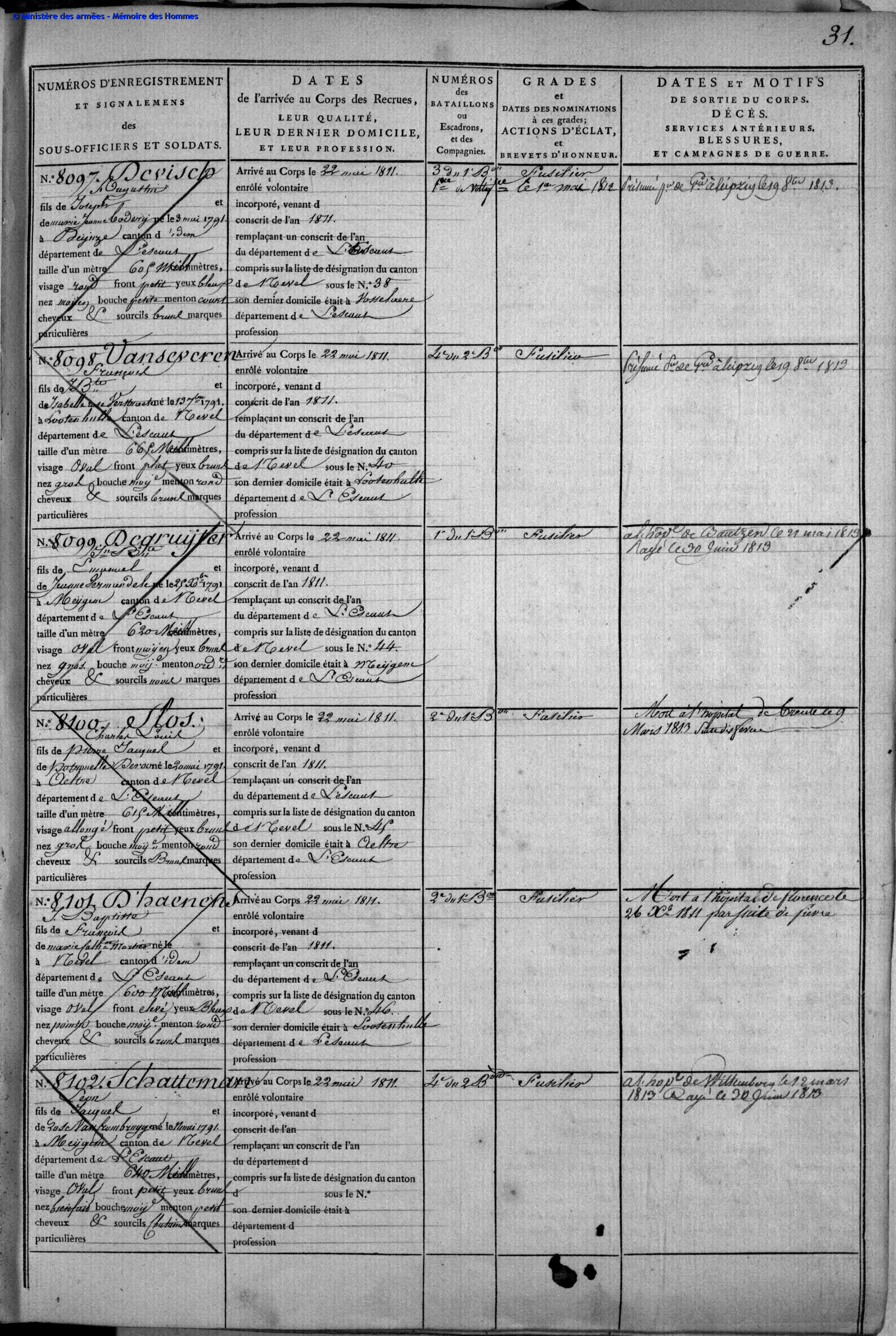 112e régiment d'infanterie de ligne, 17 mai 1811-29 mai 1812 (matricules 7 917 à 9 716), SHD/GR 21 YC 803, p. 31