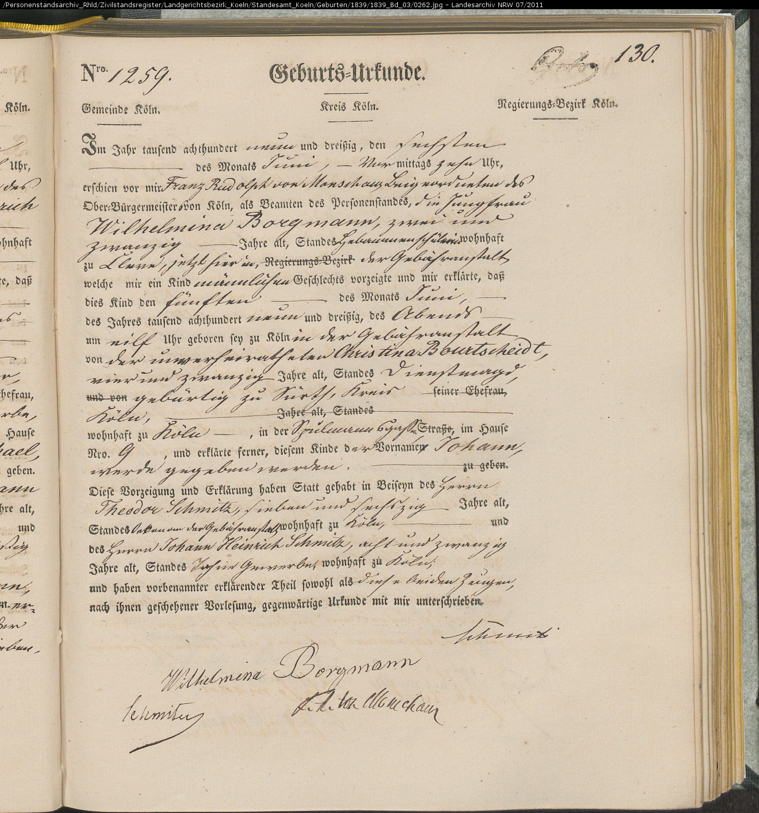 Geburten 1839 nr. 1259, Geburts-Urkunde Johann Bourtscheid