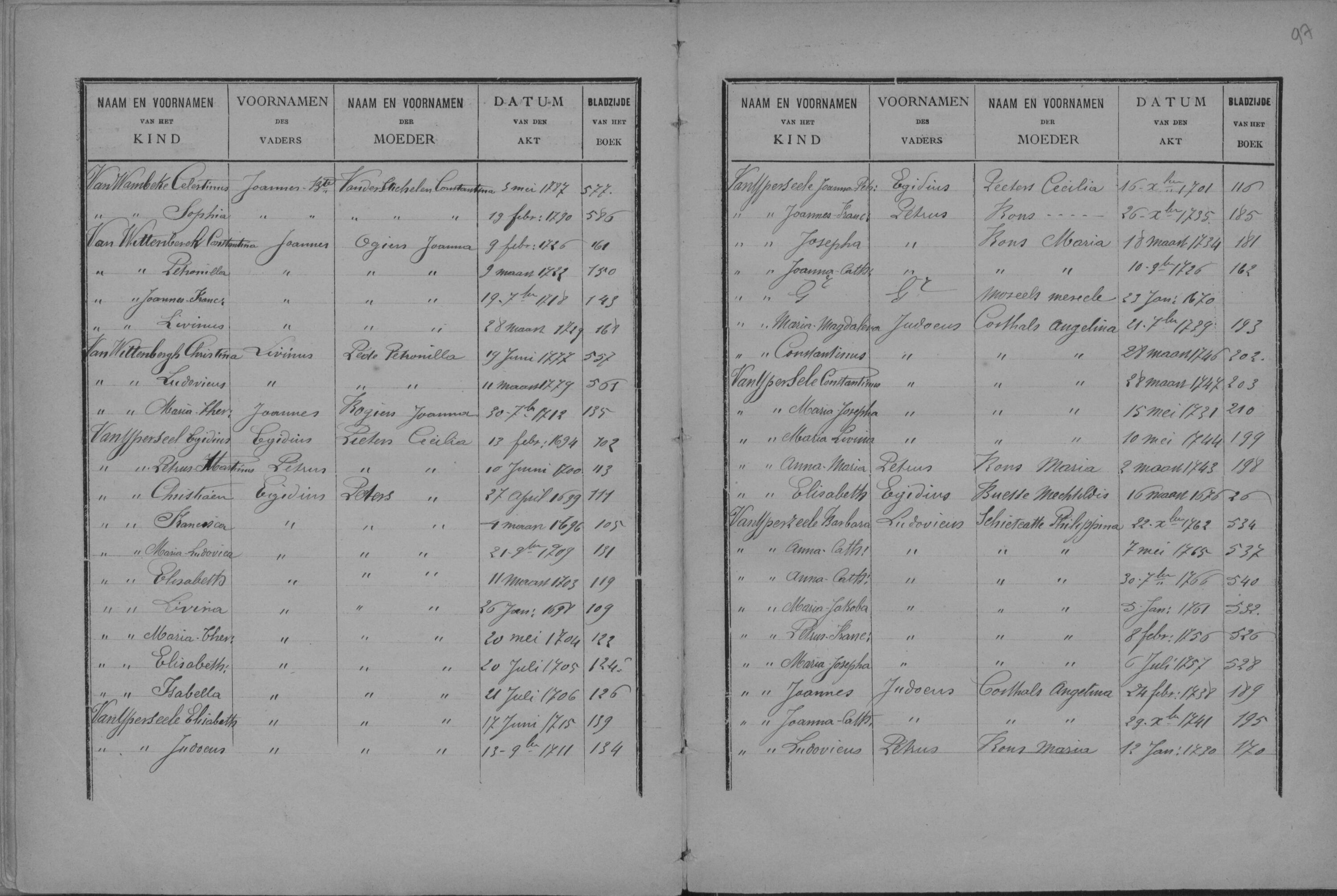 Alfabetische index doop- en geboorteakten (1648 - 1796) f96 v° Van Wittenberghe