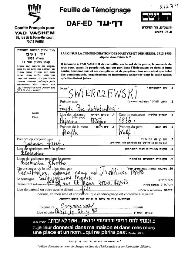 Feuille de témoignage 1913274 Frajda Pesa Zoltobrodski