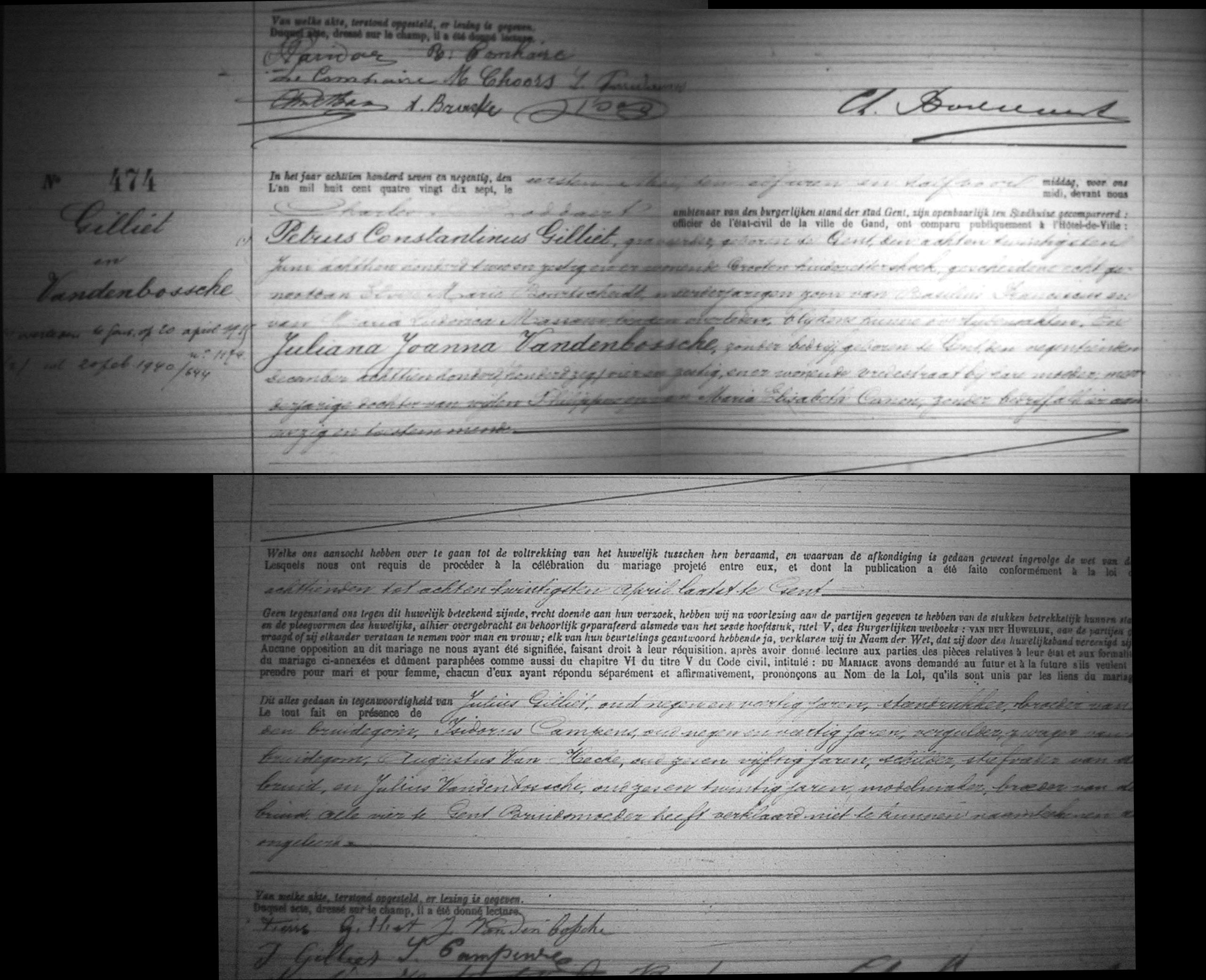 - BS/H 1897 nr. 474, Huwel. Petrus Constantinus Gilliet & Juliana Joanna Vandenbossche