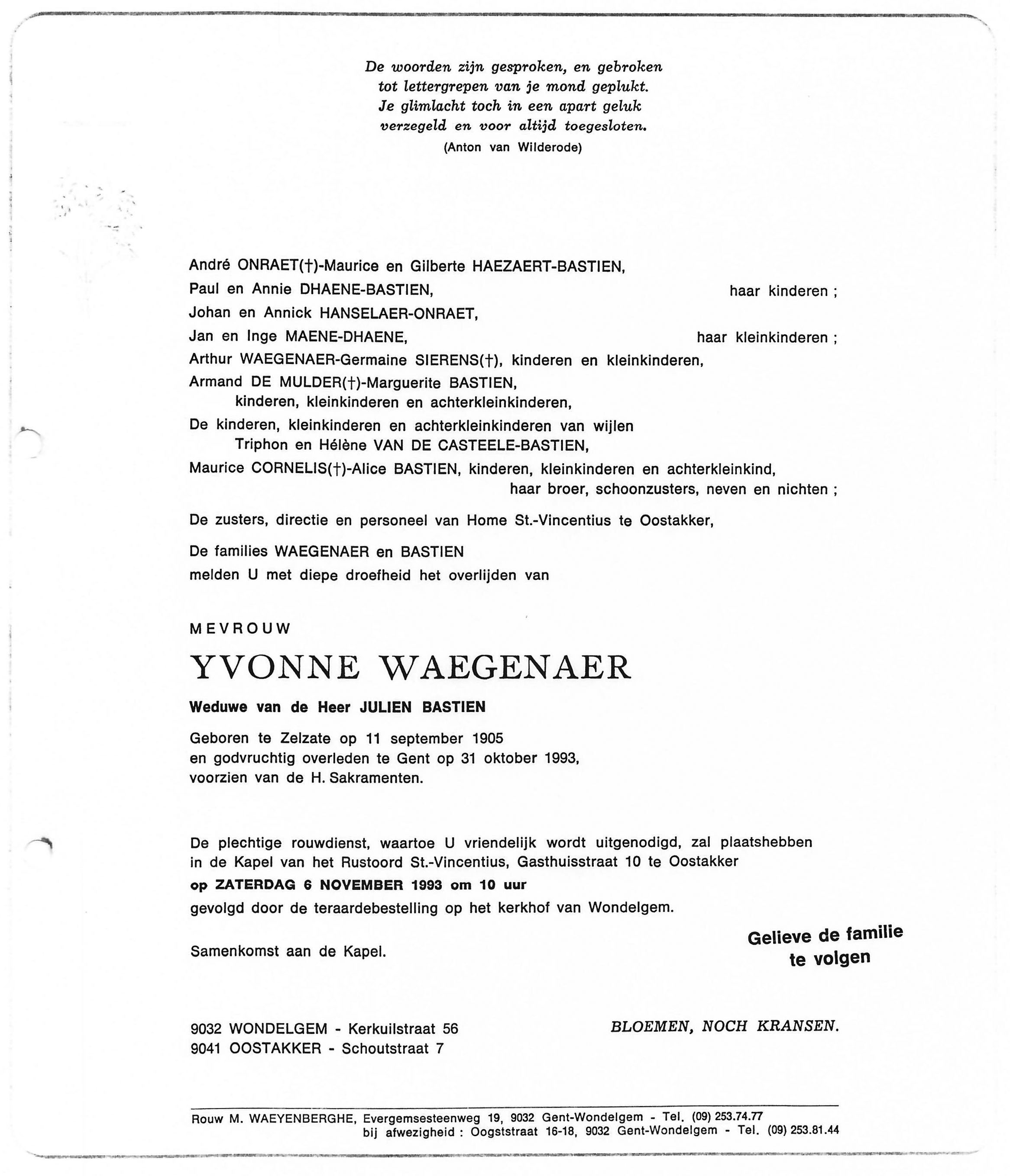 - Overlijden, Yvonne Edouard Rosalie Alice Waegenaer [E0356]
